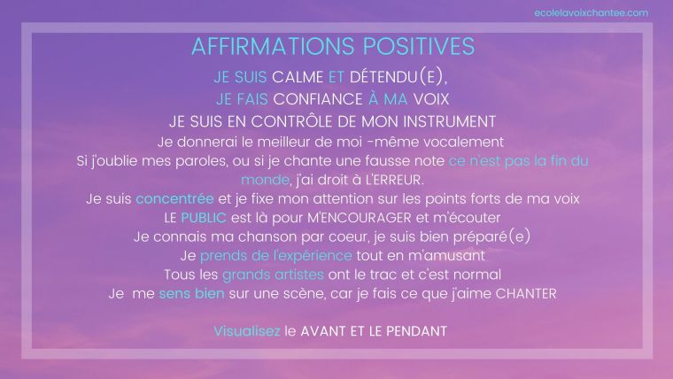 Rassurez-vous tous les grands artistes ont le trac! Nous pouvons grâce à certaines petites astuces, changer la vision que l’on a du TRAC. Apprendre à tranquillement, l’apprivoiser comme on apprivoise sa propre voix…Un pas à la fois, un jour à la fois, une expérience à la fois!