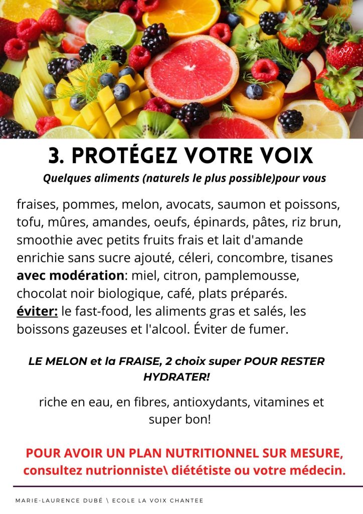 Pour avoir une belle voix, on ne peut pas sauter les étapes….il faut suivre des cours de chant régulièrement, faire un échauffement vocal entre 3 et 5 fois semaine avec des vocalises et de rester positif face à sa voix. Par contre l’alimentation peut nous aider à avoir plus d’énergie et être en santé . Il y a certains aliments et boissons à éviter afin d’avoir une belle voix! Dans ce cours de chant en ligne, je vous donne mes super astuces pour prendre soin de votre voix et manger mieux! Fruits, légumes protéines, tisanes…et quels sont les boissons à éviter ?